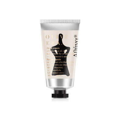 This luxurious hand cream combines the moisturizing properties of organic Greek olive oil , aloe vera , vitamin B3 (niacinamide) , panthenol , and glycerin with the sensual scent of amberwood and sea salt . The light, non-greasy texture absorbs quickly and leaves skin feeling velvety soft—ideal for daily care of stressed hands.